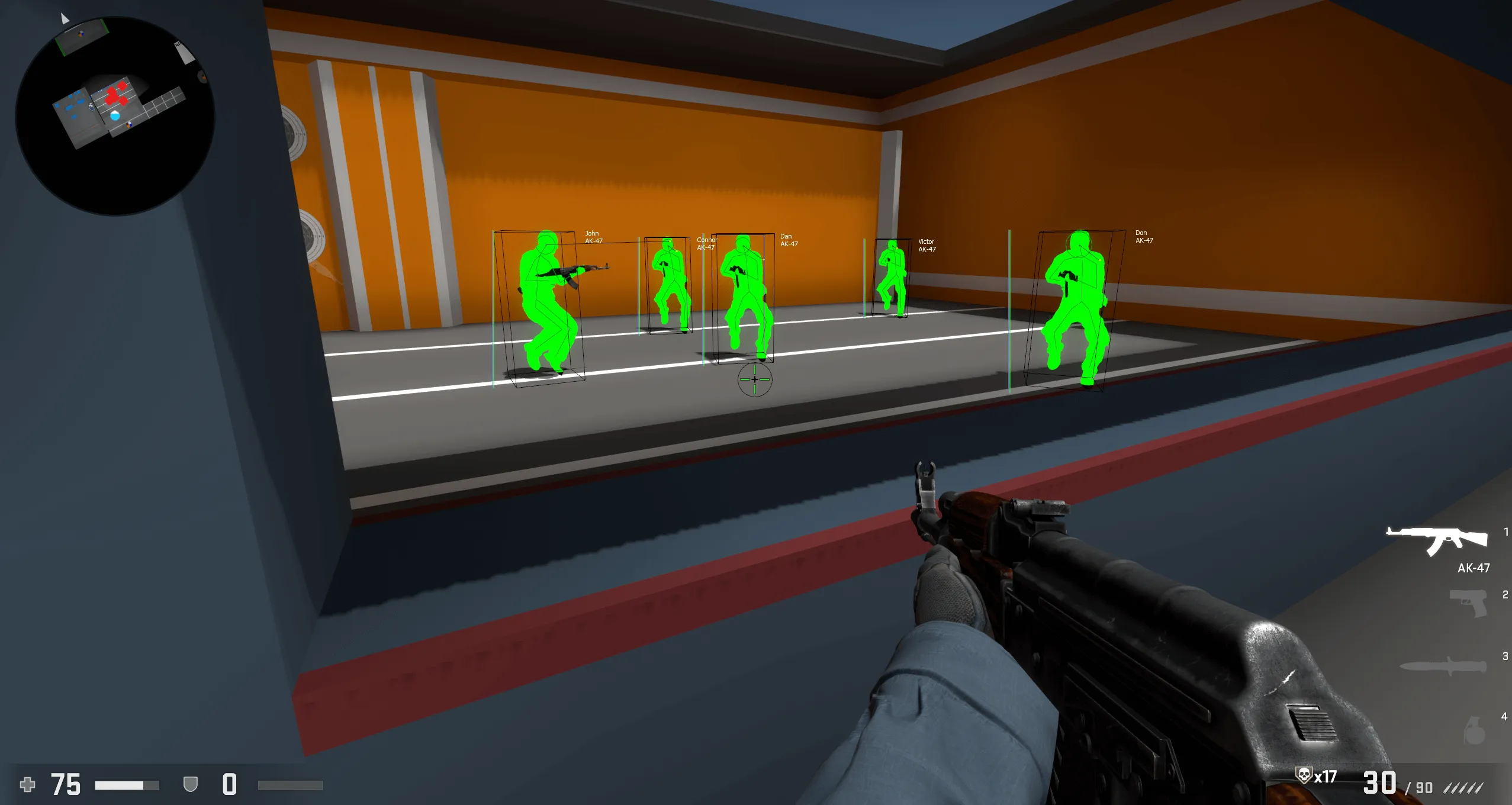 ESP-фичи давали полный визуальный контроль над ситуацией. Отображались боксы, скелеты, направление взгляда противника, никнеймы, здоровье и броня. Дополнительно учитывались звуки шагов и перемещения, что делало восприятие карты более объёмным и тактически полезным.