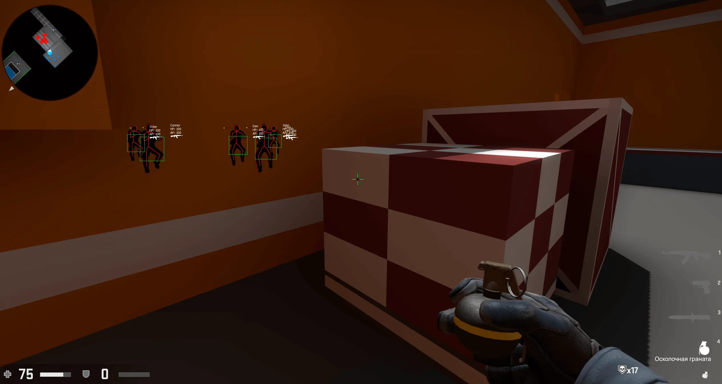 Встроенный Wallhack обеспечивал базовую визуальную информацию о противниках. Отображались ключевые данные: здоровье, броня, никнейм и положение врага. Это помогало лучше ориентироваться на карте и заранее реагировать на угрозы.
